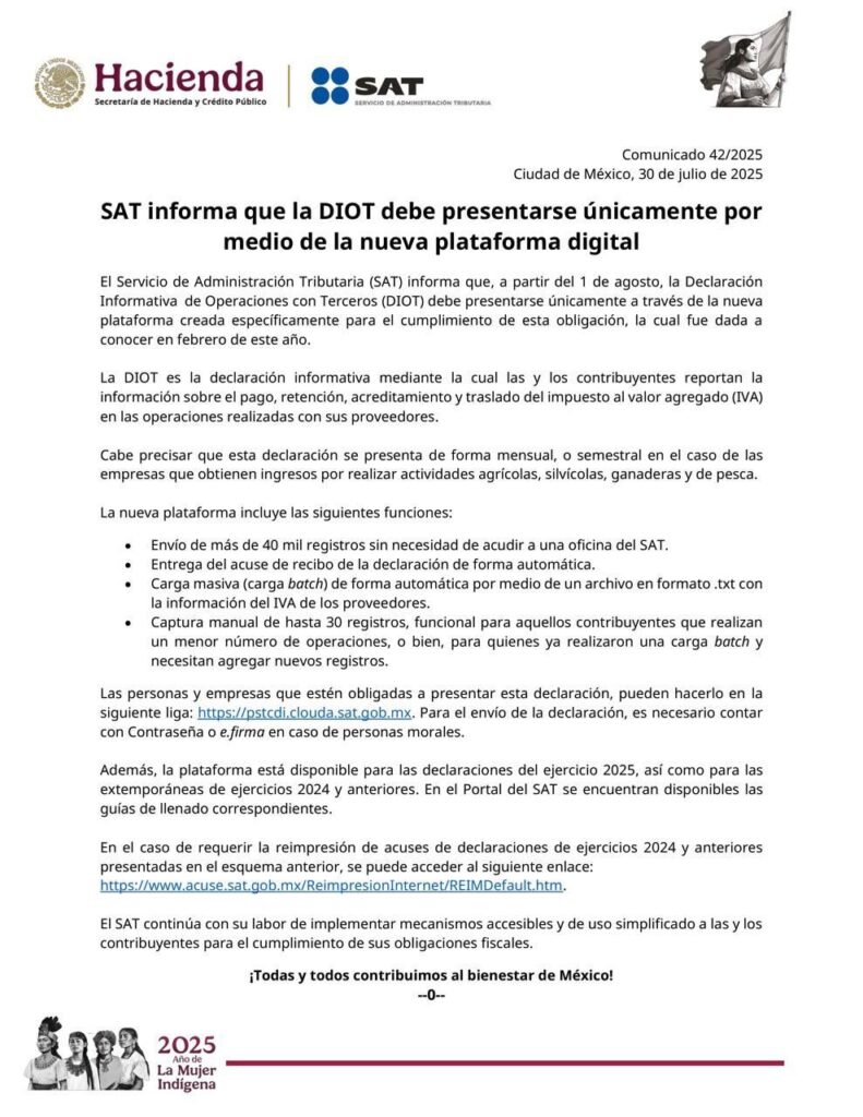 El SAT informa que, a partir del 1 de agosto, la Declaración Informativa de Operaciones con Terceros (DIOT) debe presentarse únicamente a través de la nueva plataforma digital, disponible en: pstcdi.clouda.sat.gob.mx.