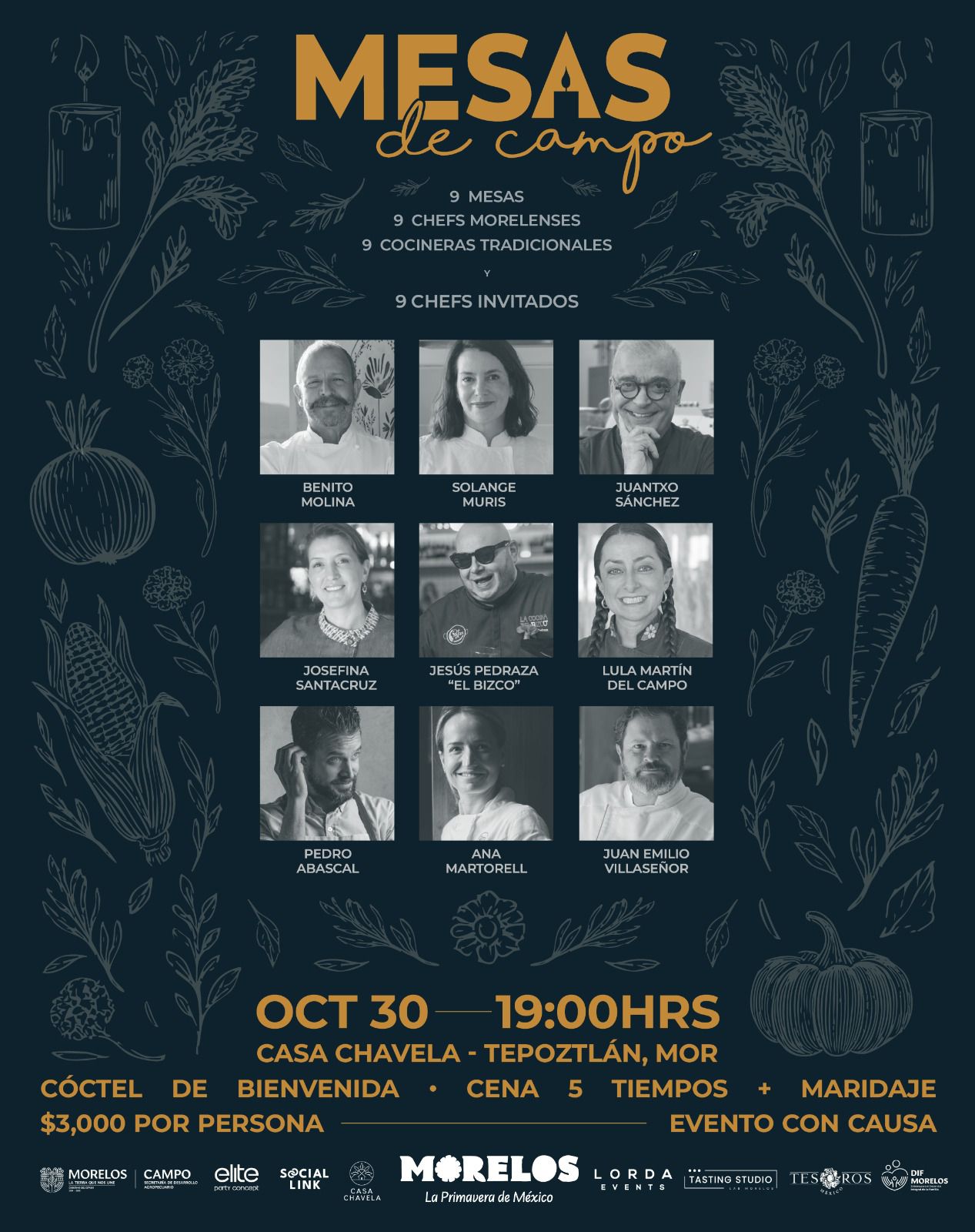 Entre los chefs participantes se encuentran Benito Molina, Solange Muris, Juantxo Sánchez, Josefina Santacruz, Jesús Pedraz “El Bizco”, Lula Martín del Campo, Pedro Abascal, Ana Martorell y Juan Emilio Villaseñor, quienes trabajarán con productos del campo morelense, origen de más de 70 por ciento del territorio fértil del estado. “Mesas de Campo” incluirá cóctel de bienvenida, cena de cinco tiempos y maridaje.