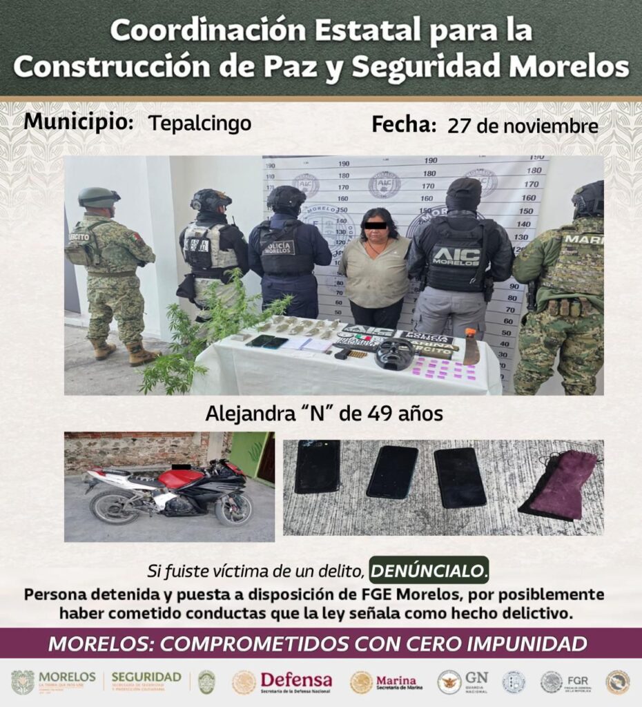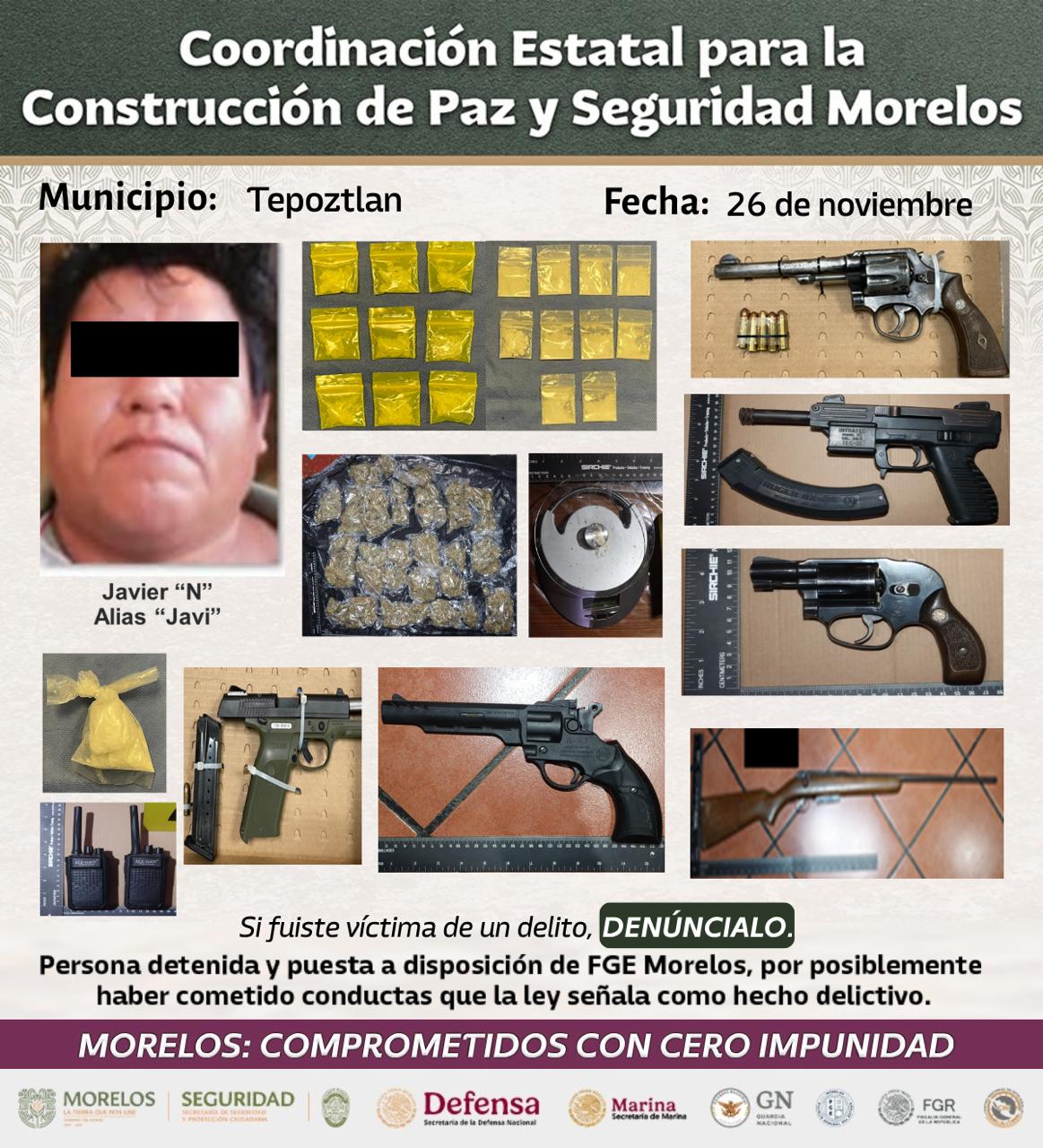 Derivado de una denuncia ciudadana, se ejecutó una orden de cateo en un domicilio del municipio de Temixco, lo que dio como resultado la detención de Luis Alberto “N” de 18 años, y se aseguró un arma de fuego corta, siete teléfonos celulares, 10 bolsas con sustancia similar al “cristal”, una bolsa con vegetal verde similar a la “marihuana”, una camisola militar con la leyenda “DEFENSA”.