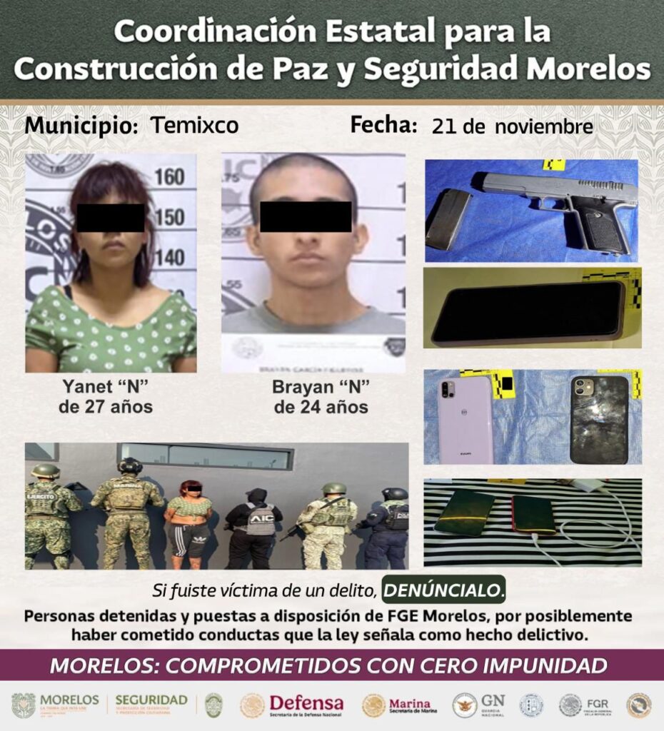 En otro tema, Urrutia Lozano destacó la detención de Giovani “N” de 25 años, alias “El Kosako” y Yessica “N” de 24 años, identificados por actos de investigación y cámaras de videovigilancia en delitos de robo en diversas tiendas de conveniencia OXXO y tiendas de autoservicio en los municipios de Emiliano Zapata, Cuernavaca, Jiutepec y Temixco.
