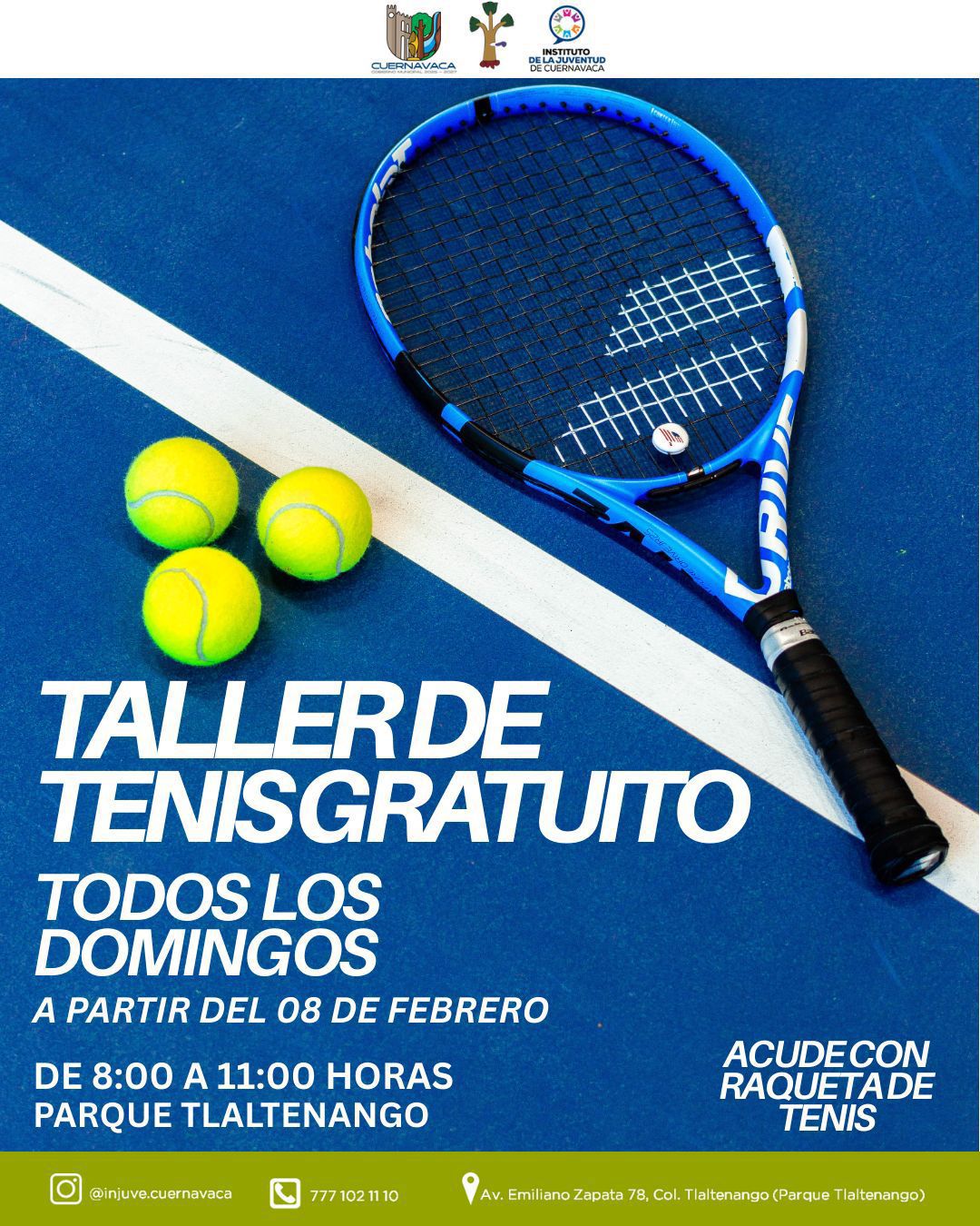 El Ayuntamiento de Cuernavaca, a través de la Secretaría de Desarrollo Humano y Participación Social (SDHyPS) y el Instituto de la Juventud de Cuernavaca (INJUVEC), invita a jóvenes de 15 a 29 años a participar en el Taller de Tenis Gratuito, una iniciativa municipal que busca fomentar la actividad física, hábitos saludables y convivencia comunitaria.