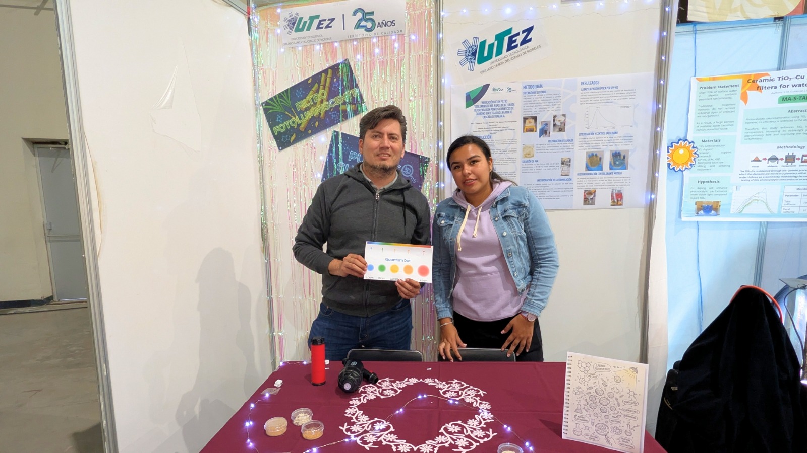 La Universidad Tecnológica Emiliano Zapata (UTEZ) celebró el triunfo de Nahomi Yized Degollado Hernández de la Ingeniería de Nanotecnología, quien obtuvo el primer lugar a nivel nacional en la ExpoCiencias Nacional 2025, realizada en Tampico, Tamaulipas, con la fabricación de un filtro fotoluminiscente a base de celulosa reforzada con puntos cuánticos de carbono sintetizados a partir de cáscaras de naranja.