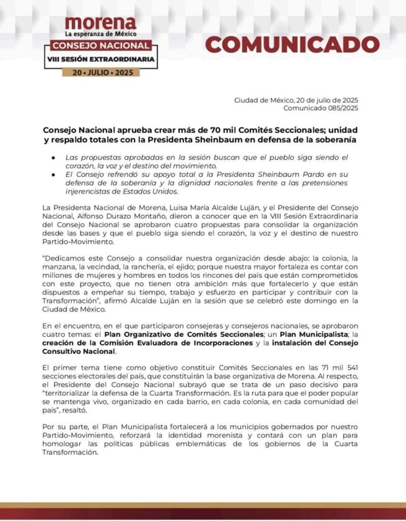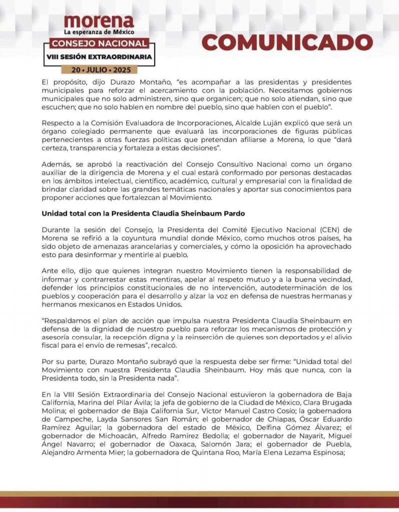 - El Consejo refrendó su apoyo total a la Presidenta Sheinbaum Pardo en su defensa de la soberanía y la dignidad nacionales frente a las pretensiones injerencistas de Estados Unidos.