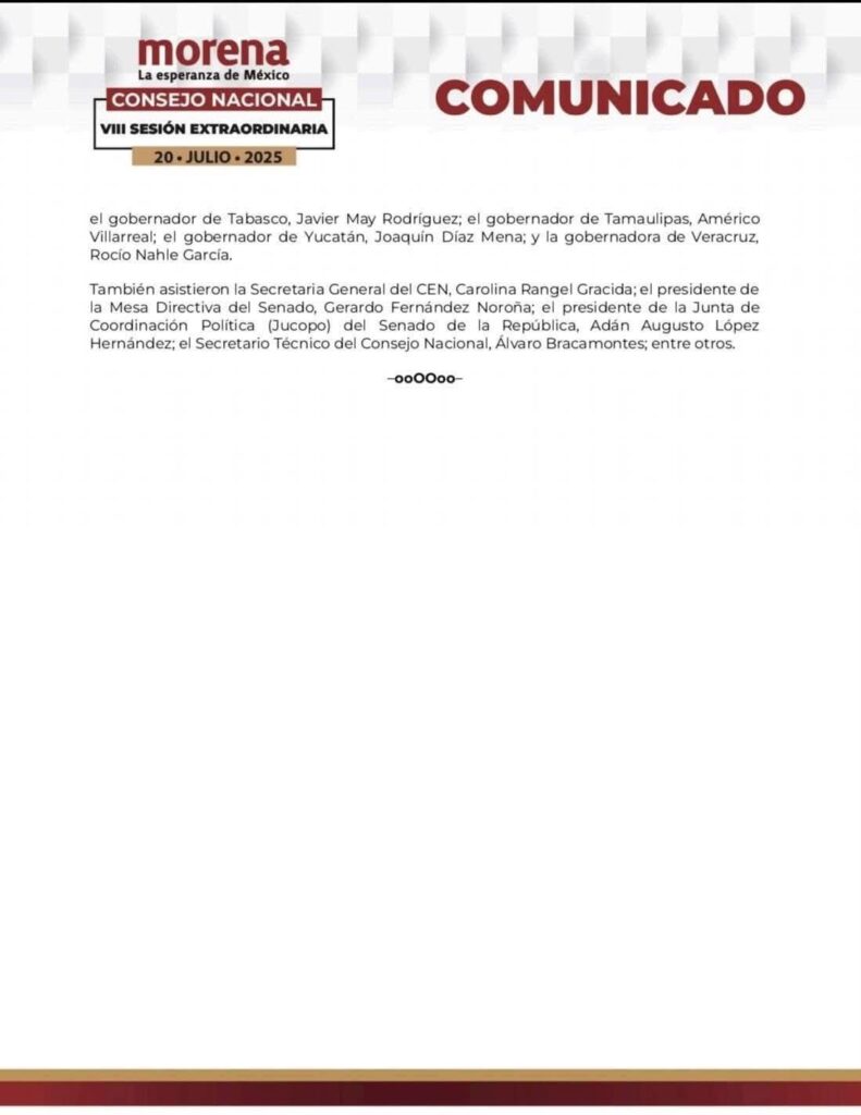 En la VIII Sesión Extraordinaria del Consejo Nacional estuvieron la gobernadora de Baja California, Marina del Pilar Ávila; la jefa de gobierno de la Ciudad de México, Clara Brugada Molina; el gobernador de Baja California Sur, Víctor Manuel Castro Cosío; la gobernadora de Campeche, Layda Sansores San Román; el gobernador de Chiapas, Óscar Eduardo Ramírez Aguilar; la gobernadora del estado de México, Delfina Gómez Álvarez; el gobernador de Michoacán, Alfredo Ramírez Bedolla; el gobernador de Nayarit, Miguel Ángel Navarro; el gobernador de Oaxaca, Salomón Jara; el gobernador de Puebla, Alejandro Armenta Mier; la gobernadora de Quintana Roo, María Elena Lezama Espinosa; el gobernador de Tabasco, Javier May Rodríguez; el gobernador de Tamaulipas, Américo Villarreal; el gobernador de Yucatán, Joaquín Díaz Mena; y la gobernadora de Veracruz, Rocío Nahle García.
