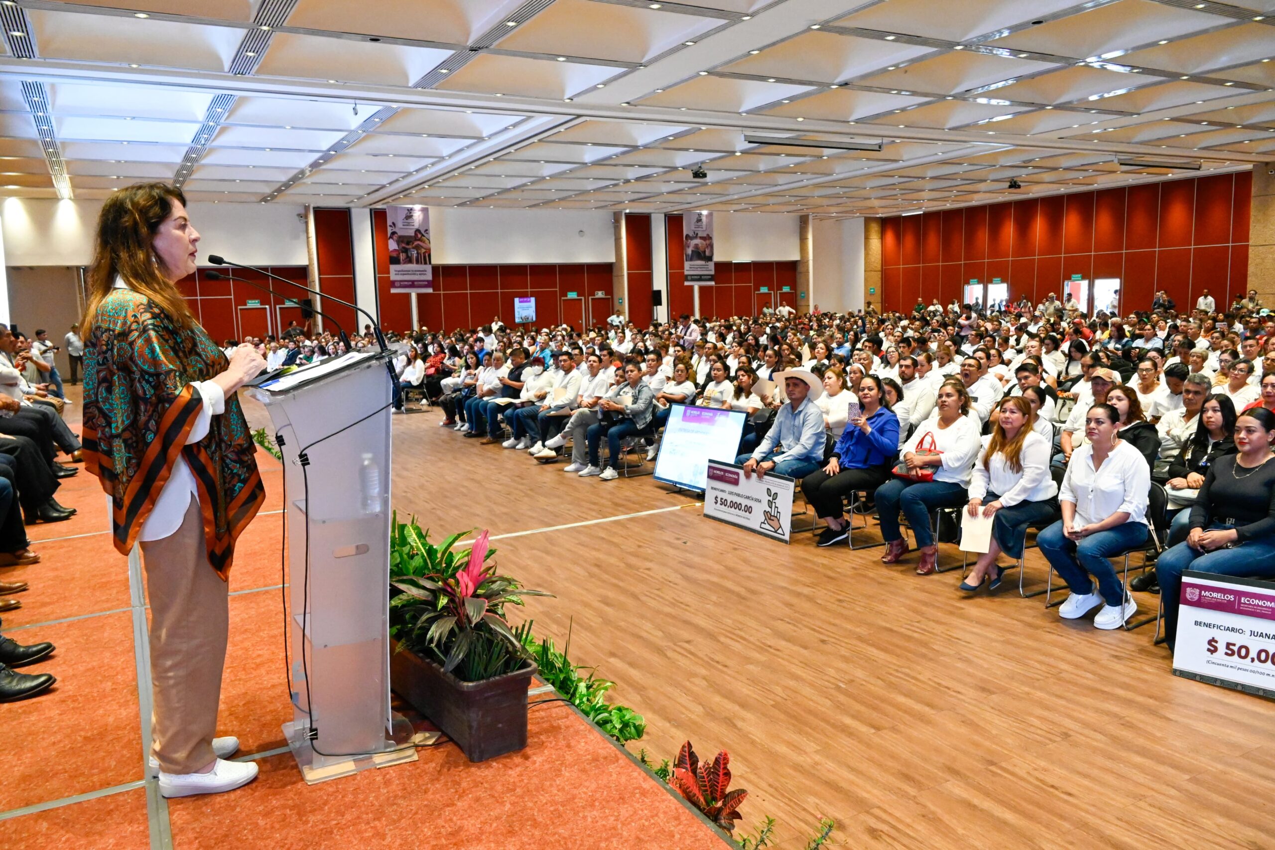 Durante el acto, la gobernadora González Saravia entregó de manera simbólica tres cheques representativos, de un total de 570, a Reyna Arredondo Rodríguez, de Jiutepec (transformación); Luis Pablo García Sosa, de Tlaltizapán (agroindustria); y Juana Martínez Teodoro, de Coatetelco (servicios).