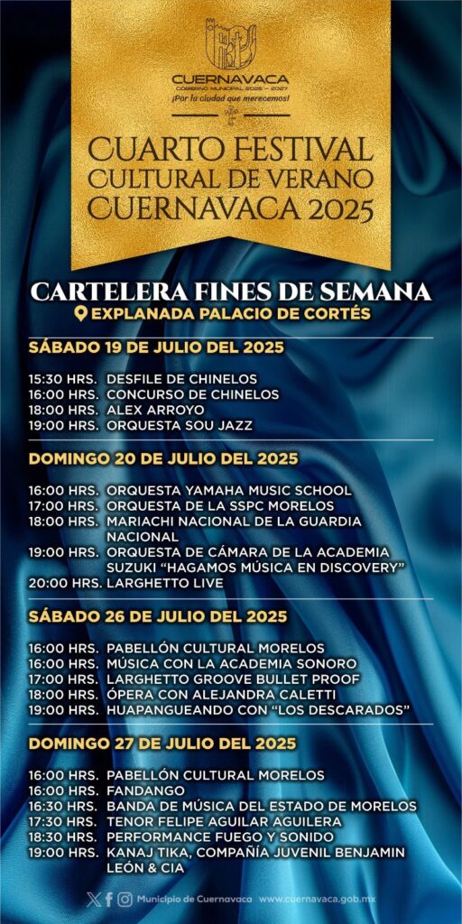 ¡Este verano, vive Cuernavaca como nunca antes! Consulta la cartelera completa en las redes oficiales del Municipio de Cuernavaca y prepárate para disfrutar de una experiencia inolvidable en una ciudad que lo tiene todo: historia, sabor, cultura y hospitalidad.