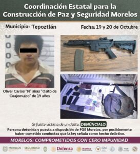 En seguimiento a un reporte ciudadano recibido al 911 sobre disparos en la localidad de San Juan Tlacoltenco, municipio de Tepoztlán, se detuvo a Oliver Carlos “N”, de 19 años, alias “El Osito de Coajomulco”, y a Marco Antonio “N”, de 22 años, quien resultó lesionado y posteriormente perdió la vida tras un intercambio de disparos con las fuerzas de seguridad.