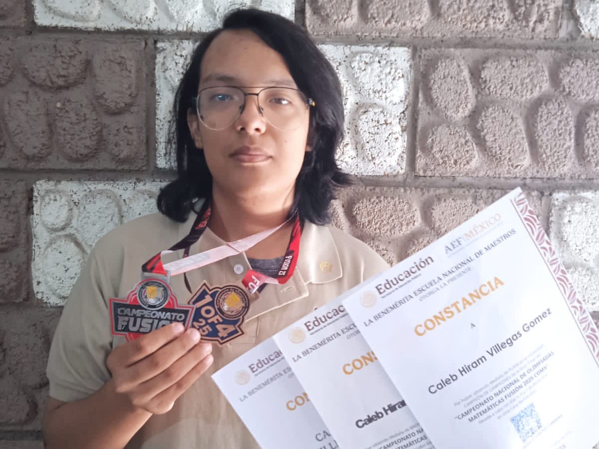 El Colegio de Bachilleres del Estado de Morelos (Cobaem) reconoce el destacado desempeño de Caleb Hiram Villegas González, alumno del plantel 02 Jiutepec, quien obtuvo medalla de plata en la modalidad Fusión, medalla de bronce en 1 vs 4 y mención honorífica en Cronos, durante el Campeonato Nacional Fusión 2025, enfocado a las olimpiadas nacionales de matemáticas.