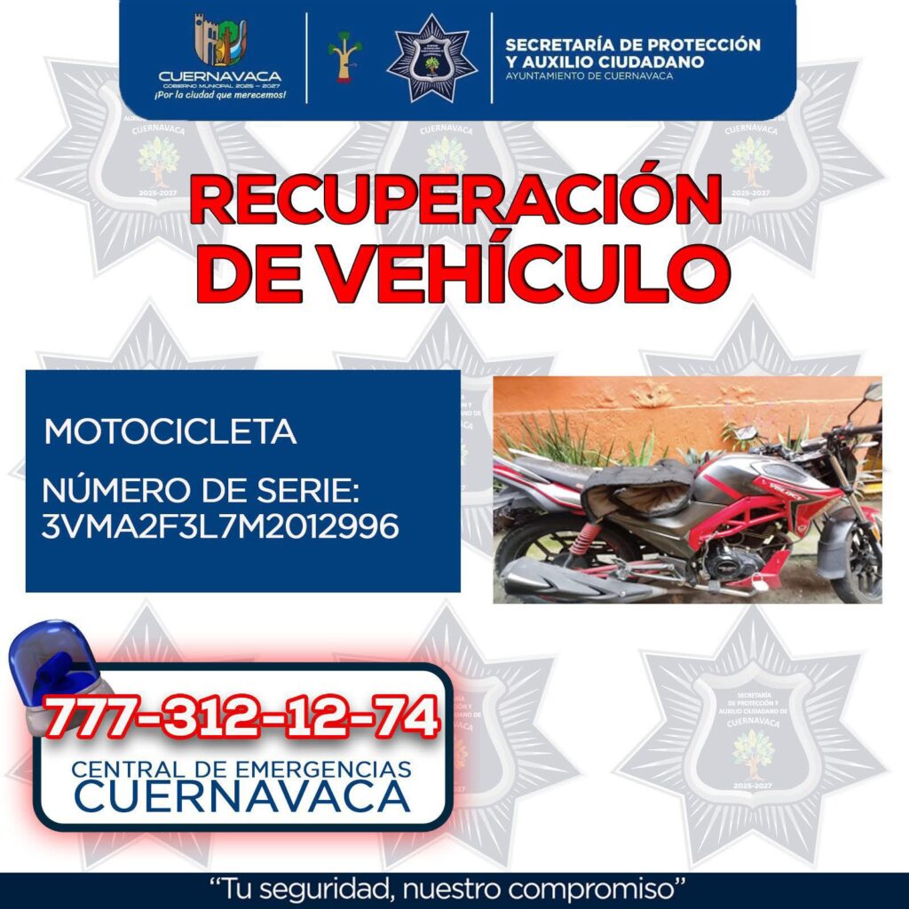 Asimismo, se recuperó una motocicleta Veloci tipo Razzer, color rojo, modelo 2021, con número de serie 3VMA2F3L7M2012996, reportada como robada en la colonia Adolfo Ruiz Cortines.