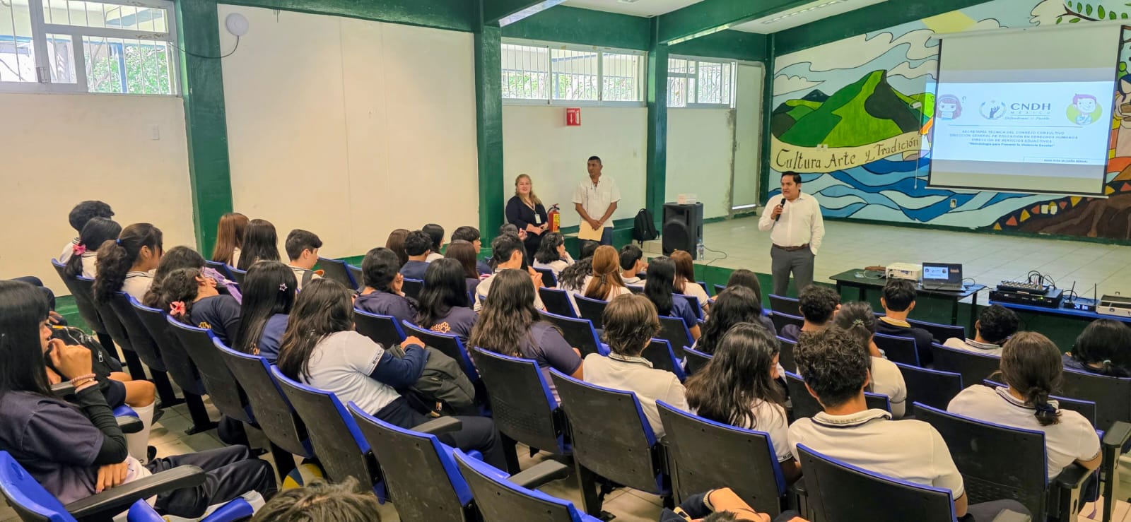 Con el propósito de brindar a las juventudes herramientas para identificar, prevenir y atender situaciones de violencia en sus entornos escolares y comunitarios, la Dirección General de Derechos Humanos de la Secretaría de Gobierno, en coordinación con la Comisión Nacional de Derechos Humanos (CNDH) y el municipio de Xochitepec, impartió la capacitación “Metodología de la Prevención de la Violencia Escolar” a estudiantes del Colegio de Bachilleres del Estado de Morelos (Cobaem) plantel 12.