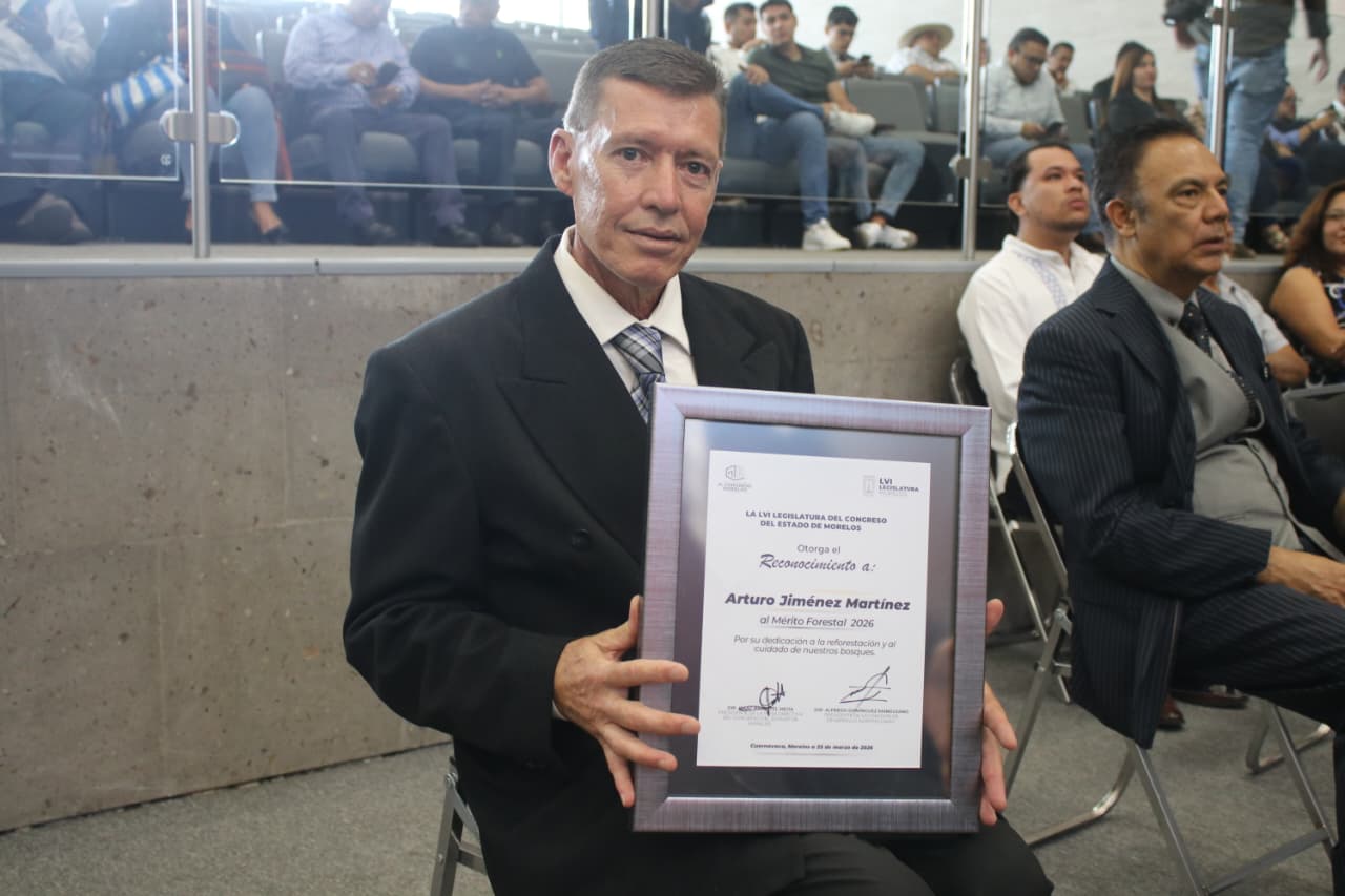En el marco del Día Internacional de los Bosques, el Congreso del Estado de Morelos entregó el Reconocimiento al Mérito Forestal 2026 a Arturo Jiménez Martínez, por su destacada labor en reforestación y conservación de los ecosistemas.