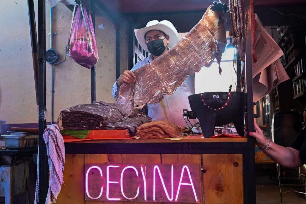 Este año se estima que la Feria de la Cecina y Tianguis Grande, en la que participarán productoras y productores de cecina, salsas, quesos, miel, tortillas, nopal, aguacate y mezcal, así como artesanas, artesanos y prestadores de servicios locales, registre una afluencia de 100 mil visitantes durante los días principales y una derrama económica superior a los 30 millones de pesos.