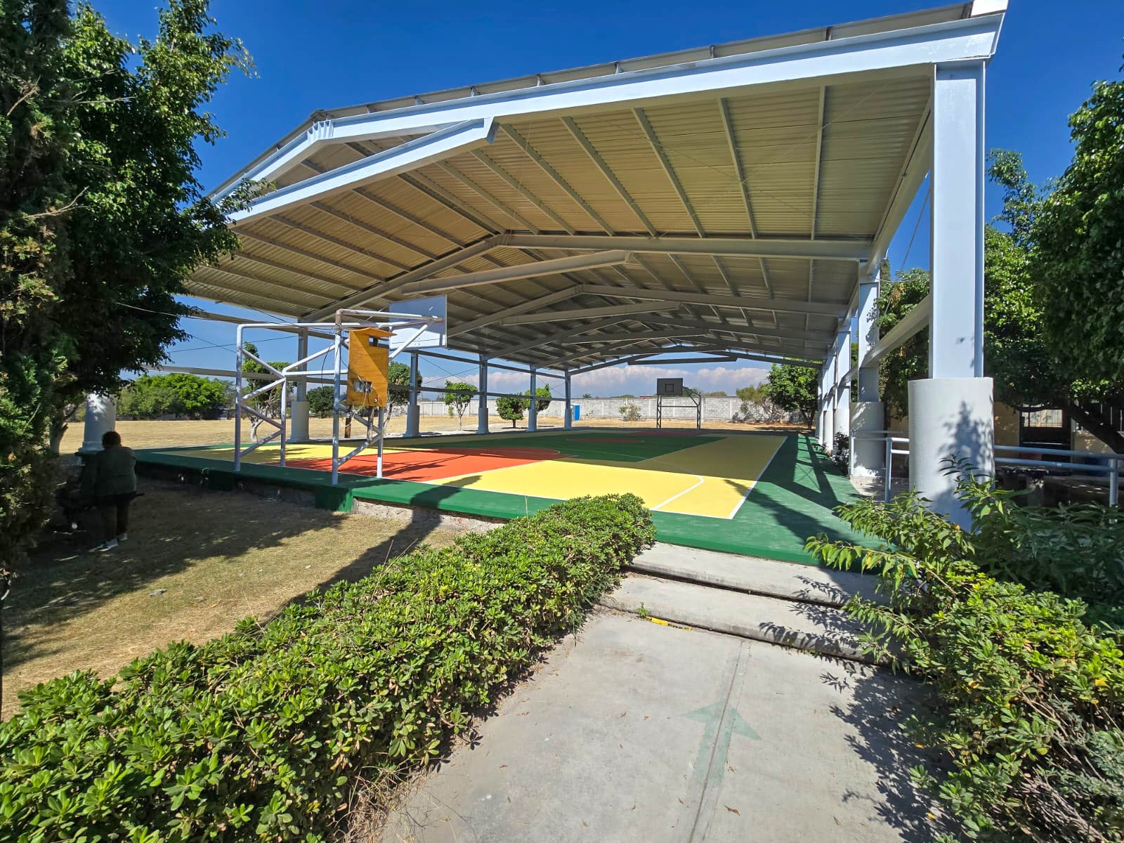 La construcción, ejecutada por la Secretaría de Infraestructura con inversión superior a 3.5 millones de pesos, incluye cimentación, columnas de acero, vigas de soporte, láminas metálicas y un sistema de desalojo pluvial.