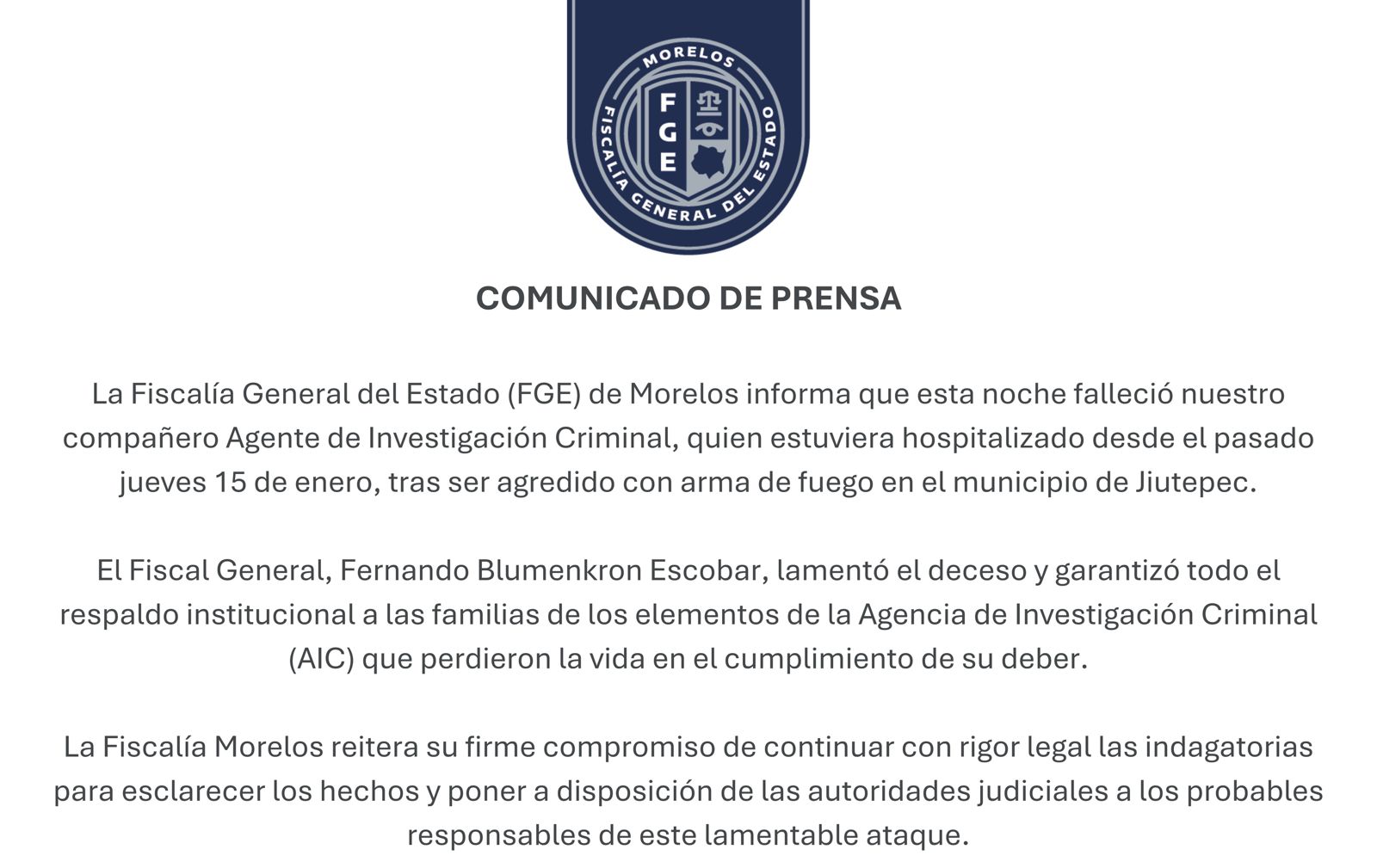 La Fiscalía General del Estado (FGE) de Morelos informó que la noche de este sábado falleció un Agente de Investigación Criminal, quien permanecía hospitalizado desde el pasado jueves 15 de enero, luego de haber sido agredido con arma de fuego en el municipio de Jiutepec.