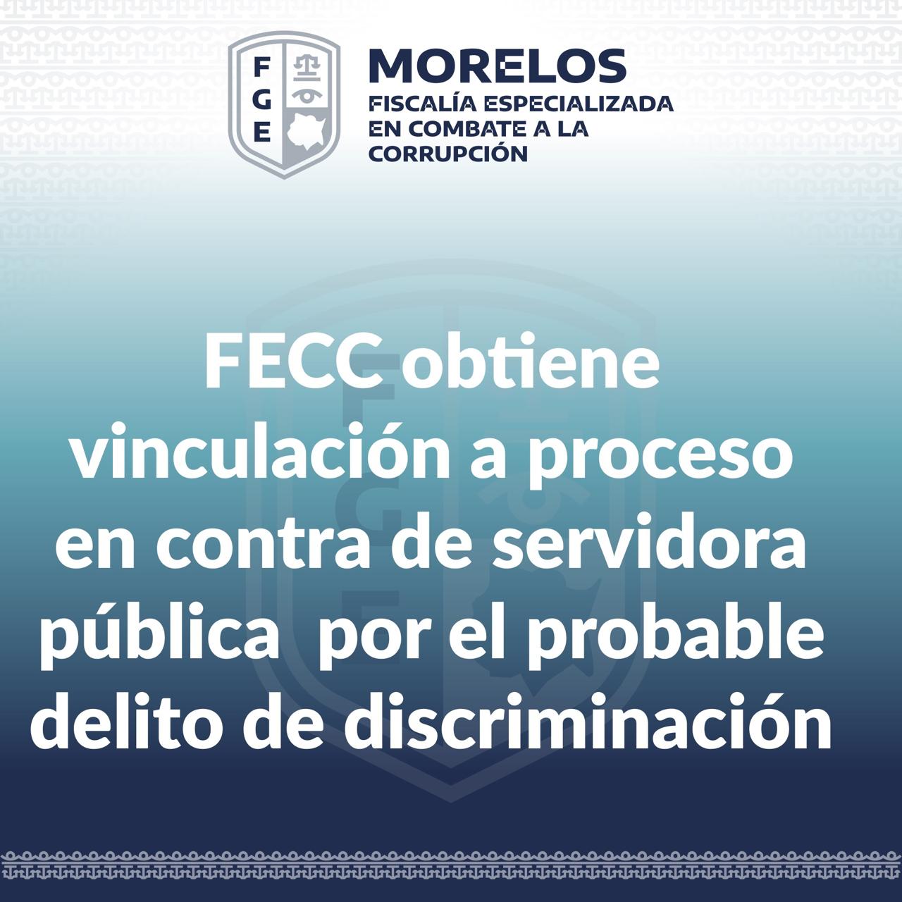 La Fiscalía Especializada en Combate a la Corrupción (FECC) obtuvo un auto de vinculación a proceso en contra de Lourdes “N”, conciliadora del Centro de Conciliación Laboral (CCL) del Estado de Morelos, por su probable participación en el delito de discriminación.