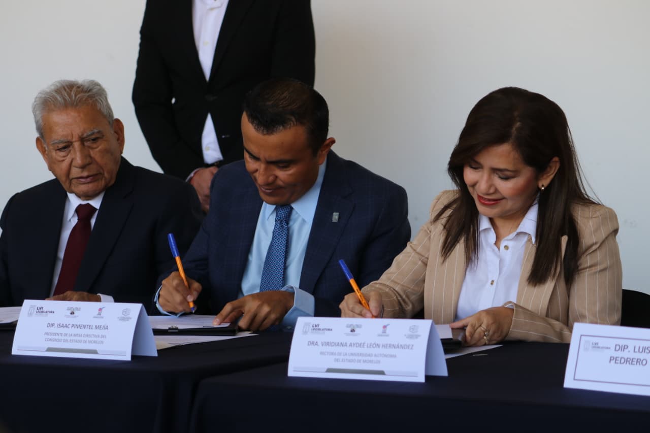 “Con este acuerdo buscamos que el quehacer parlamentario se nutra con la investigación universitaria para que nuestras leyes sean más técnicas, justas y efectivas; así mismo, permite realizar programas de capacitación en temas normativos, diseño e impartición de cursos, talleres y diplomados especializados, dirigidos al personal del Congreso; y abre las puertas a los estudiantes para realizar servicio social o prácticas profesionales, todo como una alianza por la modernidad y bienestar de Morelos”, añadió Pimentel Mejía.