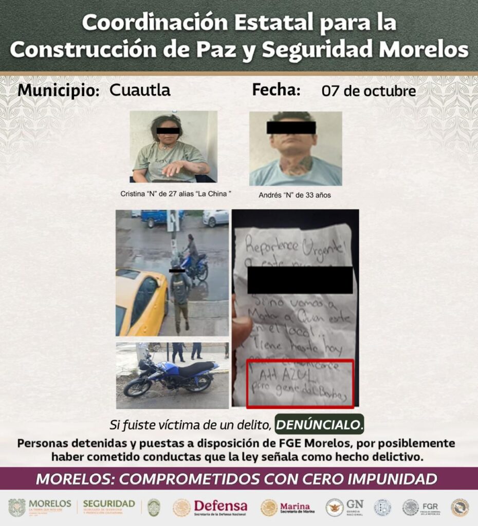 En otro hecho derivado de reportes al 911, donde indicaban actos de extorsión por medio de “papelitos” y amenazas, se ubicaron a dos parejas a bordo de motocicletas, gracias a actos de inteligencia obtenidos de videograbaciones, se ubica en tiempo real en la avenida Ferrocarril esquina con calle Bugambilias de la colonia Las Brisas del municipio de Cuautla, a dos personas quienes viajaban en una motocicleta azul similar a una identificada en video, por lo que se detuvo en flagrancia a Cristina “N” de 27 alias “La China ” y Andrés “N” de 33 años.
