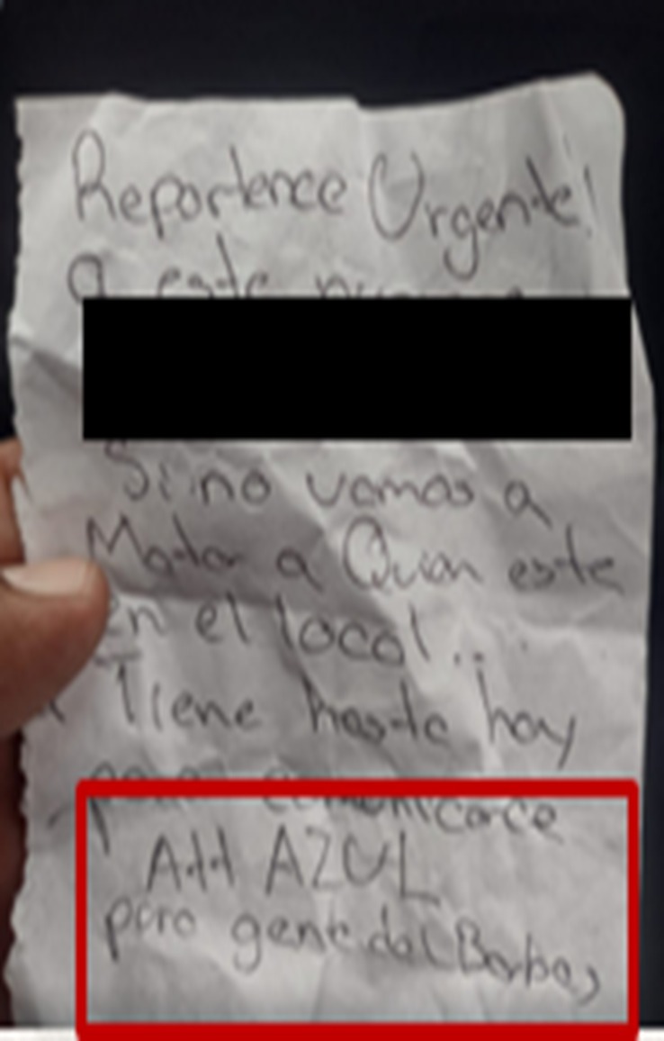 A quienes les aseguraron diversas dosis de droga con sustancia similar al “cristal”, una motocicleta azul, sin placas de circulación y un “papelito” con mensaje de extorsión en su modalidad de cobro de piso de parte del autonombrado “Azul y/o Comandante Azul” (gente del “Barbas”) con un número telefónico con frases de amenazas.