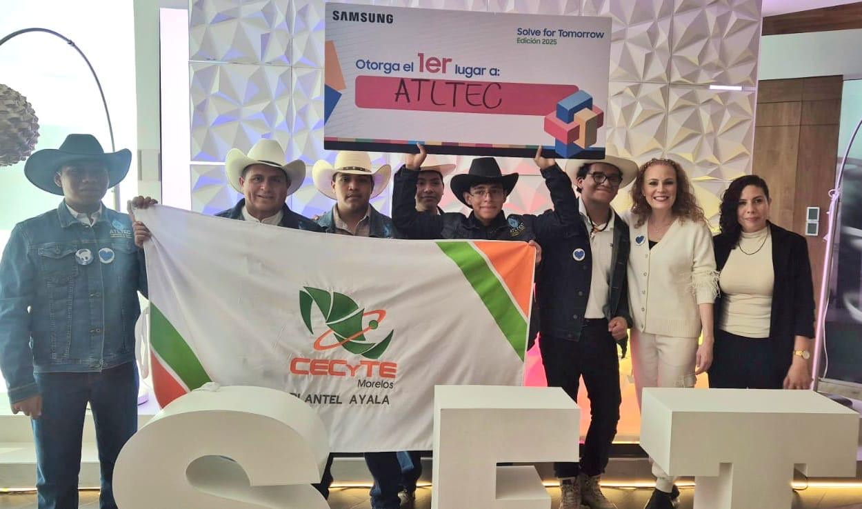 El Gobierno de Morelos que encabeza Margarita González Saravia, a través de la Secretaría de Educación y del Colegio de Estudios Científicos y Tecnológicos (CECyTE) Morelos, celebra con orgullo el triunfo de cinco alumnos y su asesor, adscritos al plantel Ayala, que obtuvieron el primer lugar a nivel nacional con su proyecto ATLTEC (Sistema de Captación y Potabilización de Agua de Lluvia), en el programa global Samsung Solve for Tomorrow 2025, que se llevó a cabo en la Ciudad de México.