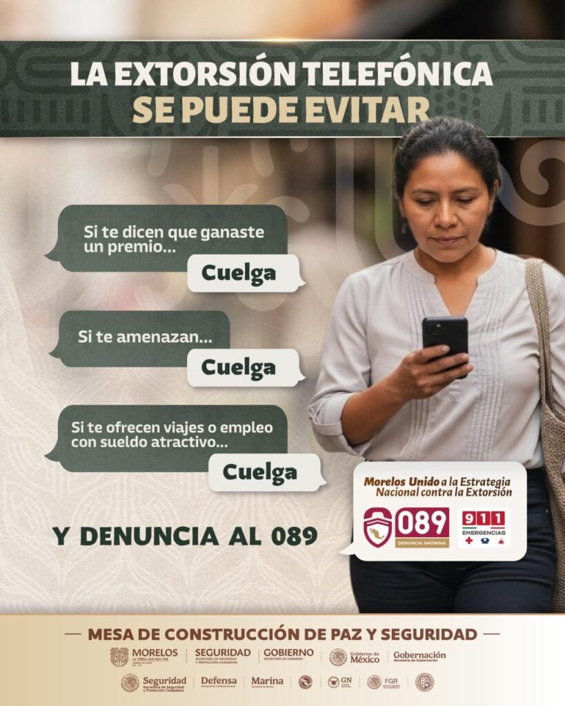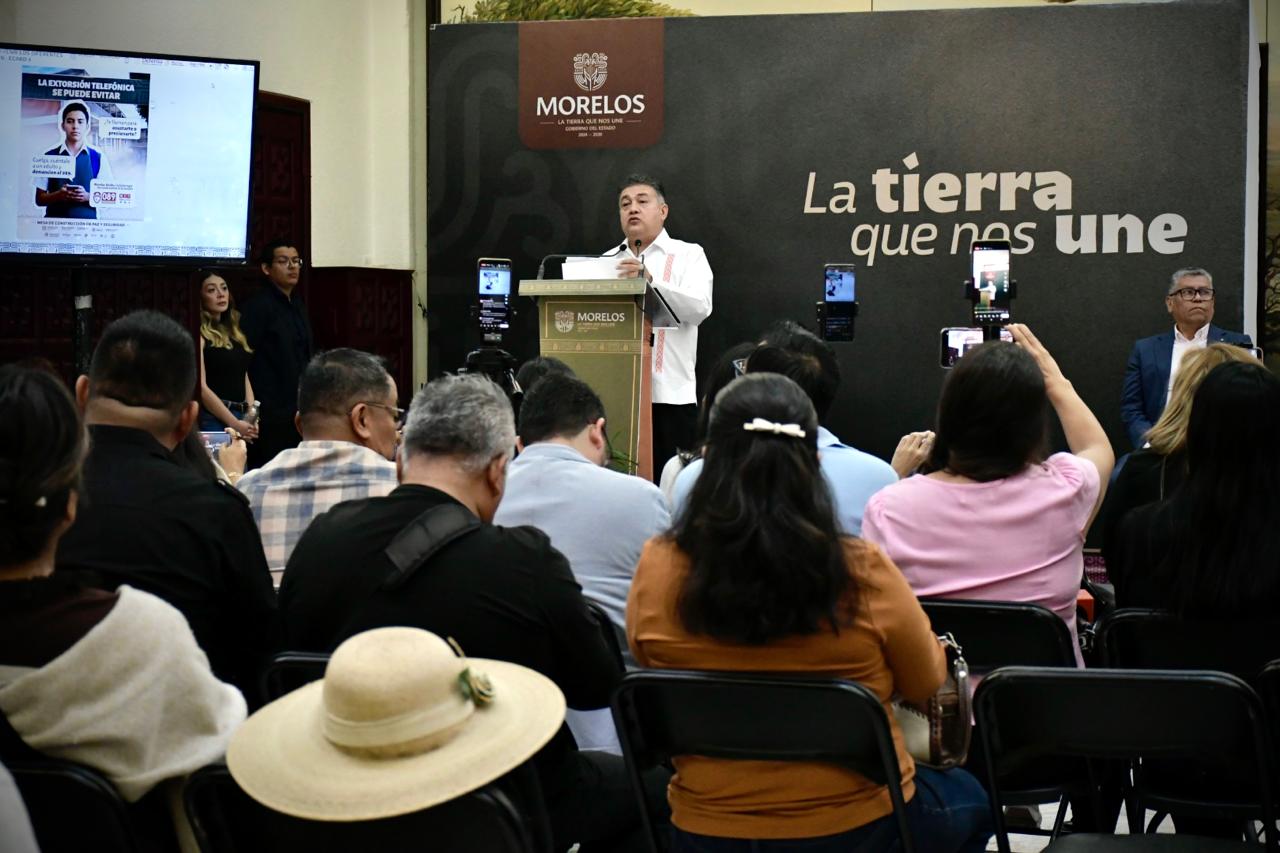 Como parte de la Estrategia Nacional contra la Extorsión impulsada por el Gobierno de México, los integrantes de la Mesa de Coordinación Estatal para la Construcción de Paz y Seguridad en el Estado de Morelos, con el respaldo del Gobierno que dirige Margarita González Saravia, pusieron en marcha la primera campaña estatal para prevenir los diferentes tipos penales de extorsión, informó el titular de la Secretaría de Seguridad y Protección Ciudadana (SSPC), Miguel Ángel Urrutia Lozano.