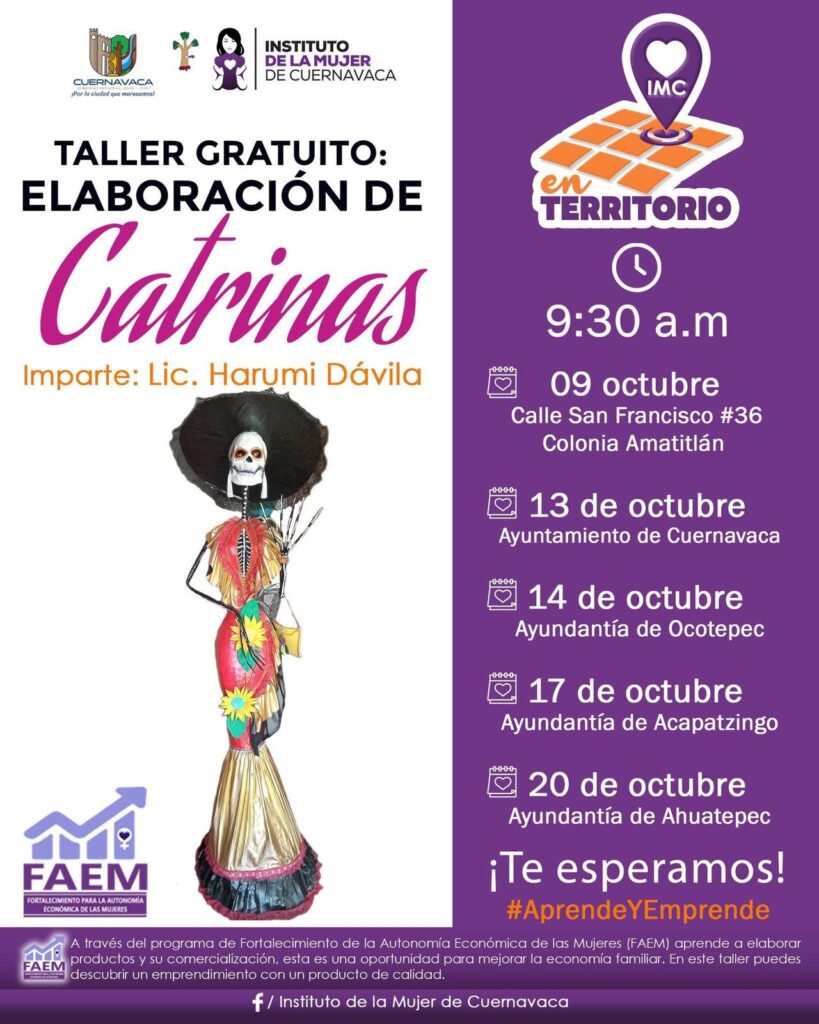 Por otra parte, el IMC invita a participar en el taller gratuito de elaboración de catrinas a través del programa de Fortalecimiento para la Autonomía de las Mujeres (FAEM), en el que las participantes podrán desarrollar sus habilidades creativas y descubrir nuevas oportunidades para mejorar su economía familiar.