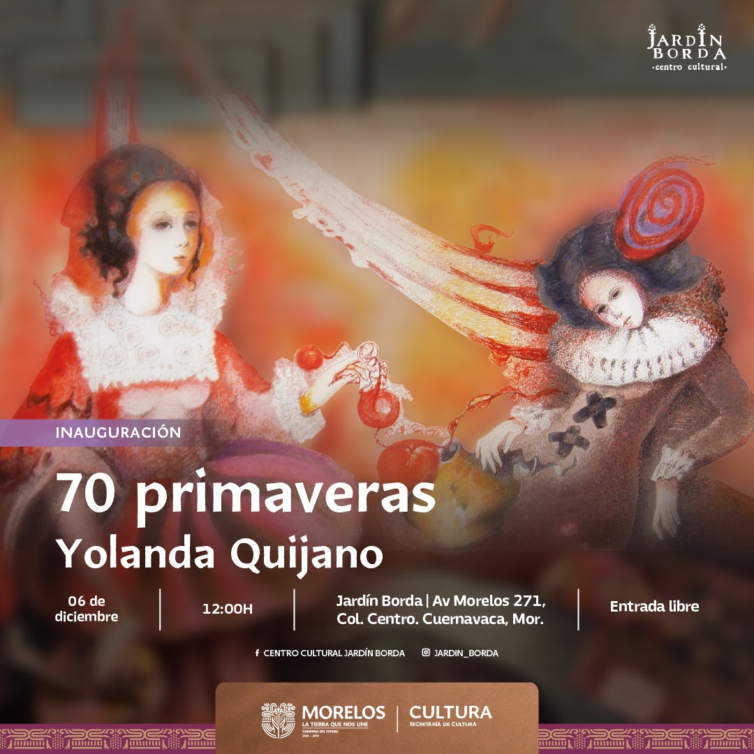 El Gobierno de Morelos, a través de la Secretaría de Cultura, invita al público general a la inauguración de la exposición “70 Primaveras. Yolanda Quijano”, que se llevará a cabo hoy sábado 06, a las 12:00 horas, en la Sala Velasco/Tamayo del Centro Cultural Jardín Borda. La actividad busca reconocer las siete décadas de trayectoria artística de la maestra Yolanda Quijano, creadora fundamental del panorama cultural morelense.