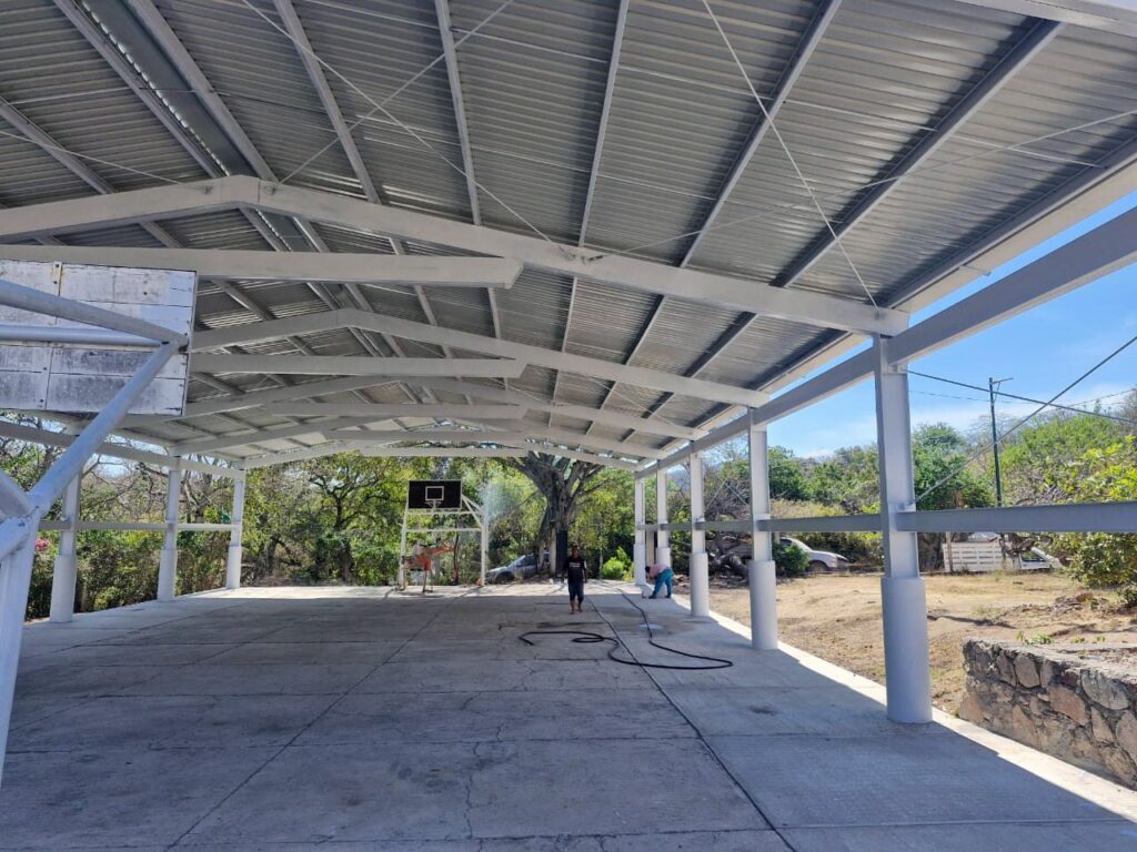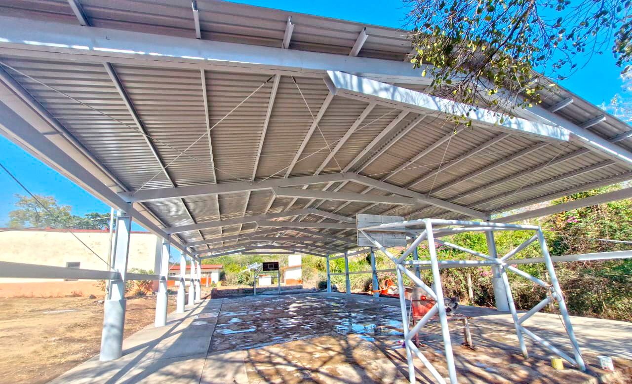 Detalló que los trabajos contemplaron cimentación y anclaje de la estructura principal de soporte, con columnas, pilares, armadura y vigas de amarre, así como colocación de lámina a dos caídas, sistema de fijación y canales de drenaje pluvial, con lo que ha quedado cubierta un área de 401 metros cuadrados de la explanada de usos múltiples del plantel.