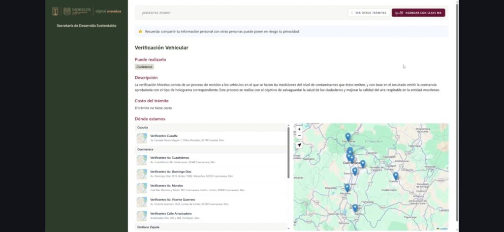 El trámite es sencillo e inicia con el sistema Llave MX. Posteriormente, la persona usuaria captura su placa, sube documentos básicos y selecciona entre los 11 centros para verificar vehículos en el estado a través de un mapa interactivo donde pueden ubicar el punto cercano a su localidad. La entidad cuenta por primera vez con una conexión directa con la Secretaría del Medio Ambiente (SEDEMA), lo que aporta mayor transparencia y control.