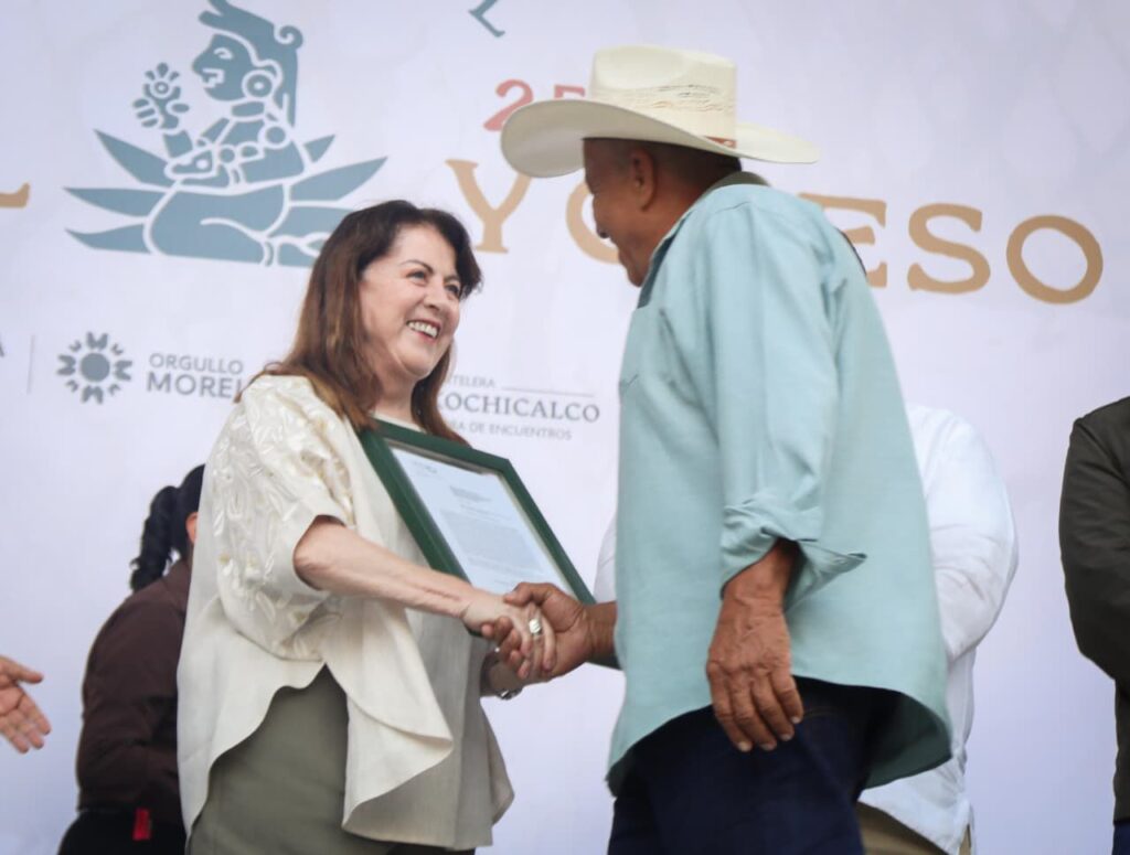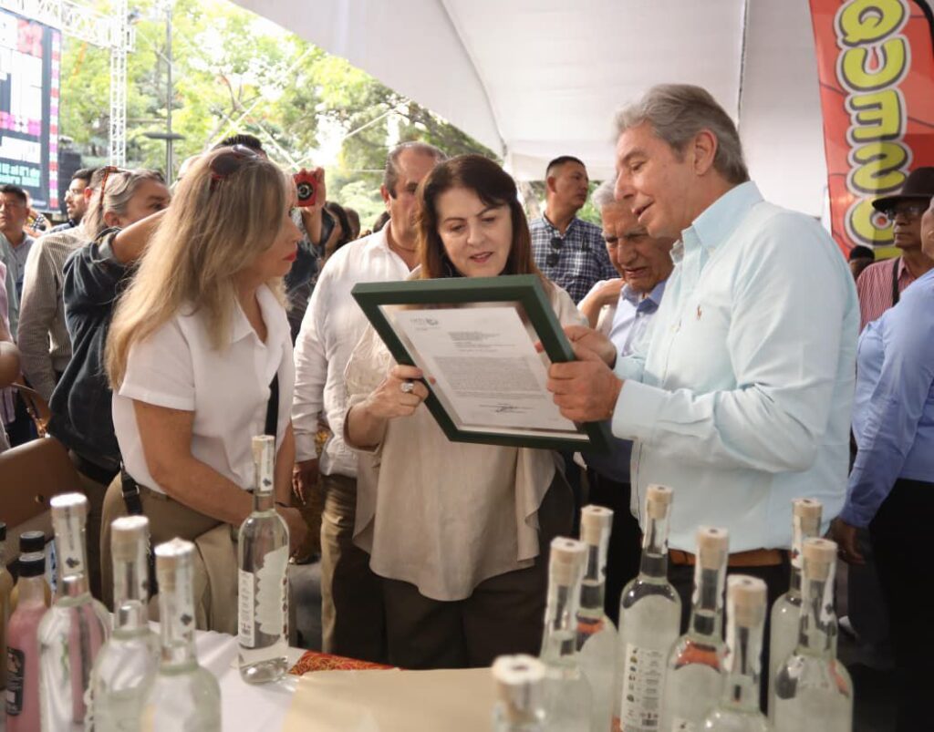 La gobernadora Margarita González Saravia entregó certificaciones de uso de Denominación de Origen Mezcal de Morelos, otorgadas por el IMPI, a dos productores de esta bebida ancestral