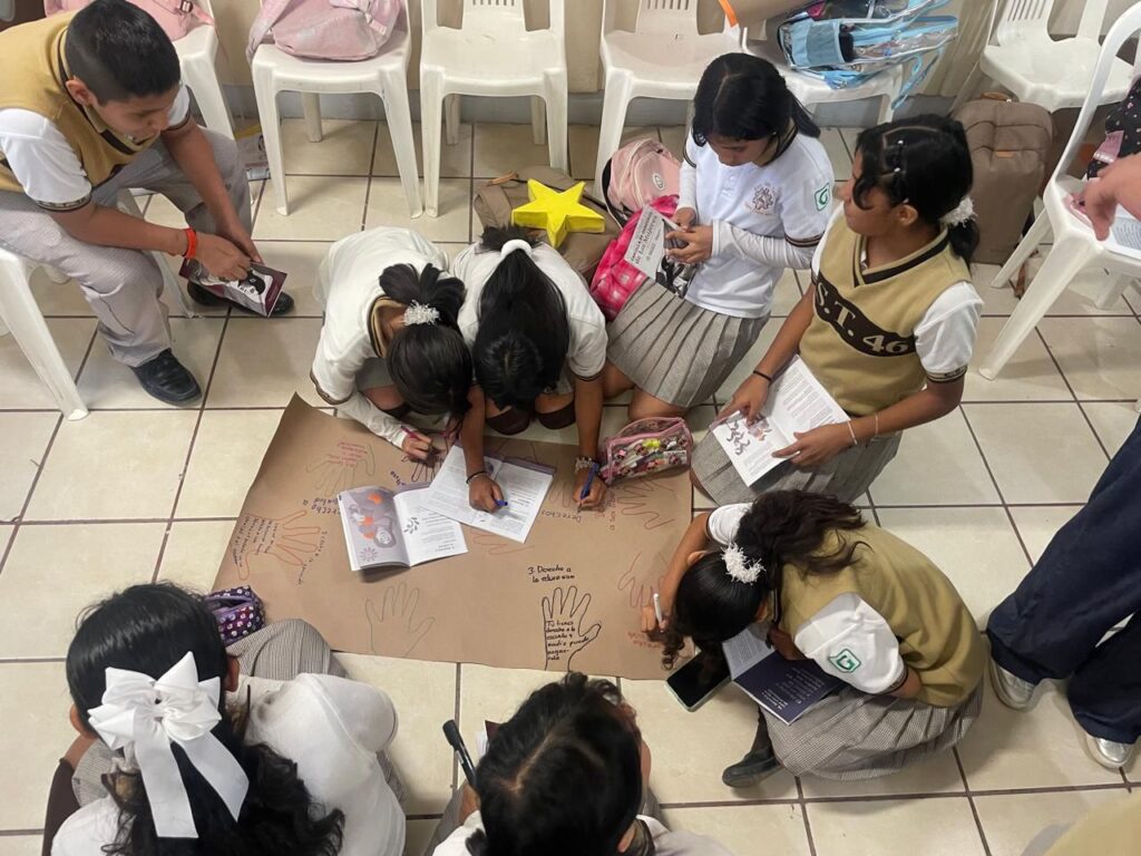 El taller, facilitado por Ixkandeox Martínez Mendoza, abrió un espacio donde el conocimiento dejó de ser teoría para convertirse en experiencia compartida. A través de actividades de integración, lluvia de ideas y trabajo colectivo, las y los adolescentes exploraron cada apartado de la cartilla de derechos: el derecho a vivir libres de violencia, a decidir sobre sus cuerpos, a estudiar, a participar, a nombrarse y a ser escuchadas y escuchados.