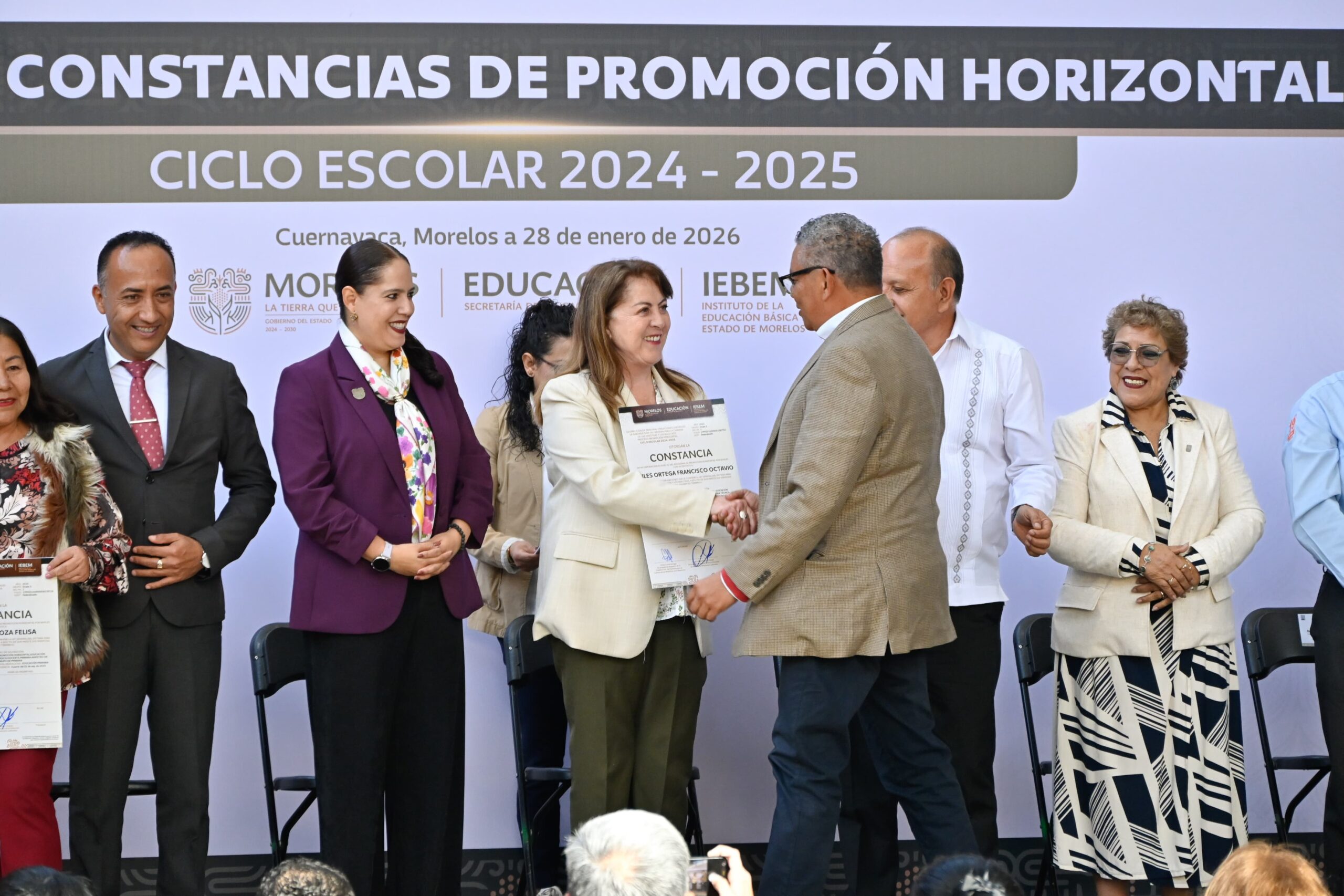 La ceremonia se llevó a cabo en la explanada del Instituto de la Educación Básica del Estado de Morelos (IEBEM), ante las y los 696 docentes beneficiados, a quienes les agradeció su dedicación y refrendó su compromiso de garantizar un gobierno honesto, transparente y cercano a las necesidades educativas del estado.