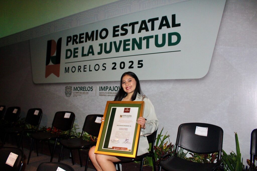 Viviana Athenea recibió de manos de la gobernadora, Margarita González Saravia, el Premio Estatal de la Juventud Morelos 2025, en la categoría de Participación en el Deporte y Promoción de la Actividad Física, ceremonia que se llevó a cabo en el Centro Cultural Teopanzolco (CCT), donde se reconoció el talento y el impacto positivo de las y los jóvenes morelenses en distintos ámbitos.