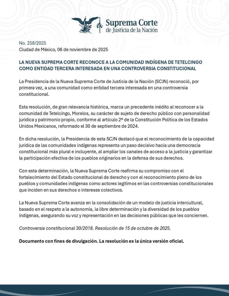 La Nueva Suprema Corte de Justicia de la Nación (SCJN) marcó un hecho histórico al reconocer por primera vez a una comunidad indígena como entidad tercera interesada dentro de una controversia constitucional. Se trata de la comunidad de Tetelcingo, Morelos, la cual fue reconocida como sujeto de derecho público con personalidad jurídica y patrimonio propio.