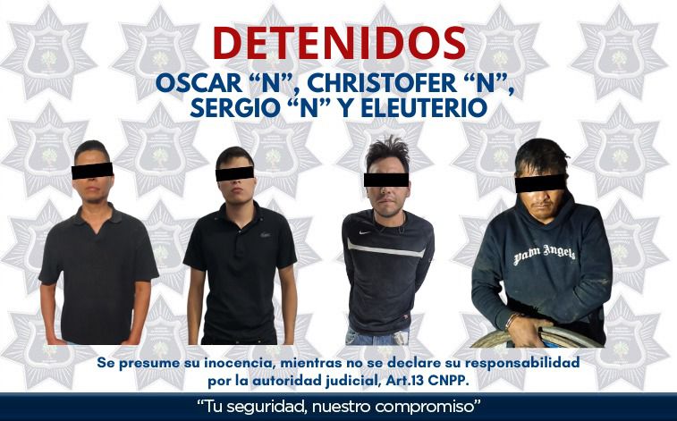 Asimismo, se realizó la detención de Oscar “N”; Christofer “N”; Sergio “N” y Eleuterio “N” quienes fueron puestos a disposición del Ministerio Público, para determinar su situación jurídica.