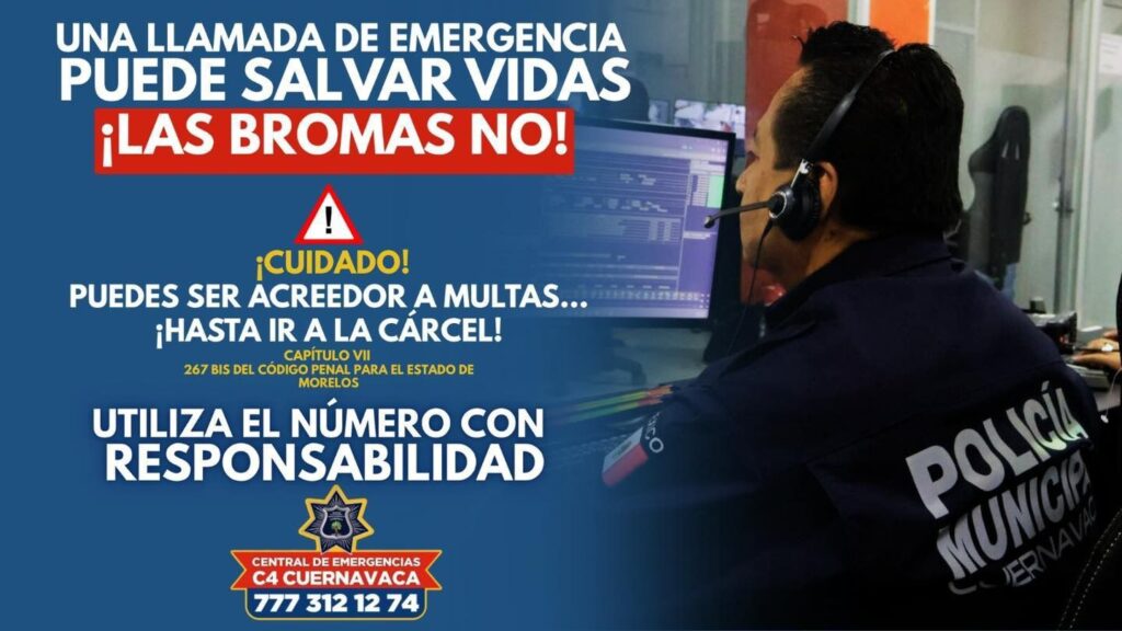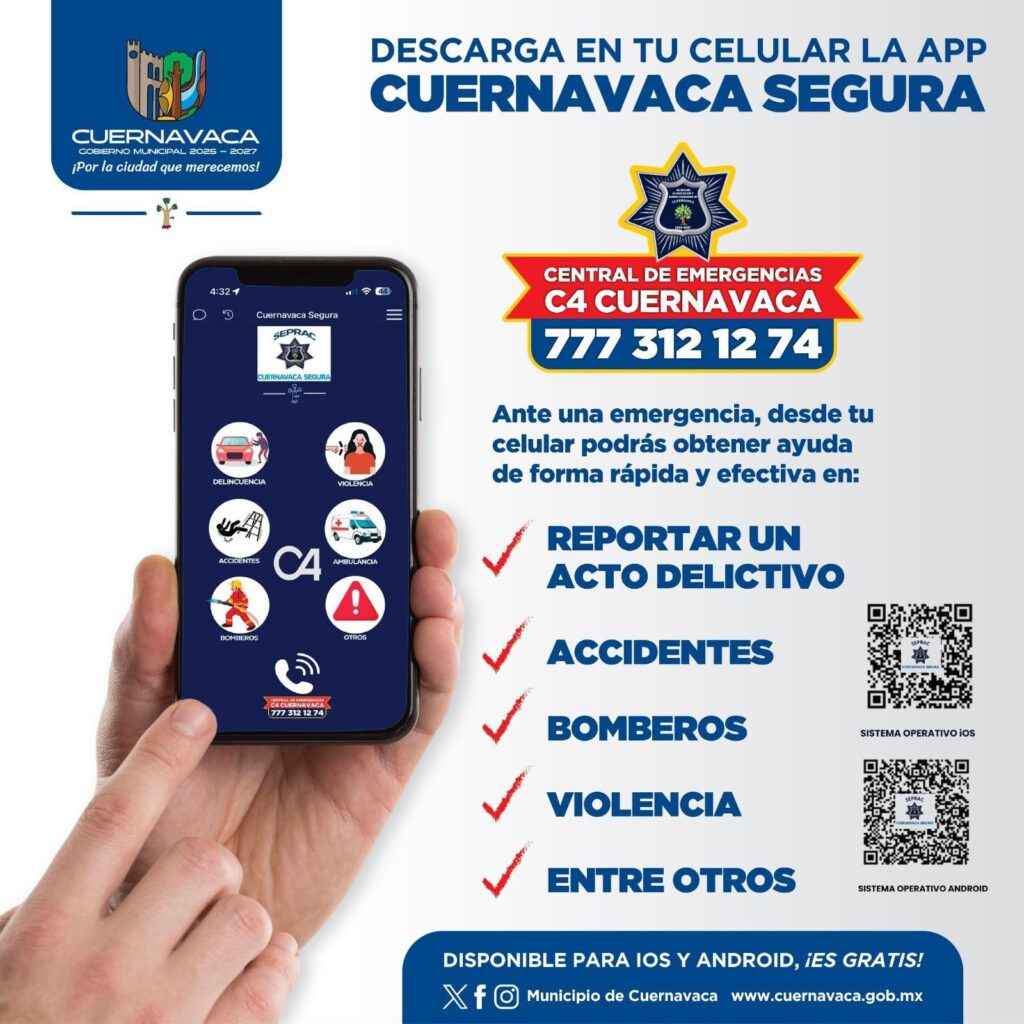 Ante cualquier situación de emergencia marcar al número del C4, el 777-312-12-74 disponible las 24 horas, o a través de la aplicación gratuita “Cuernavaca Segura” disponible para iOS y Android.