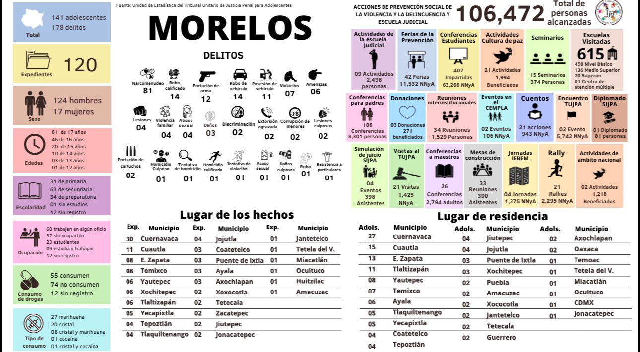 Durante el periodo de enero a diciembre de 2025, un total de 141 adolescentes estuvieron involucrados en 178 delitos en el estado de Morelos, informó la Unidad de Estadística del Tribunal Unitario de Justicia Penal para Adolescentes (TUJPA).