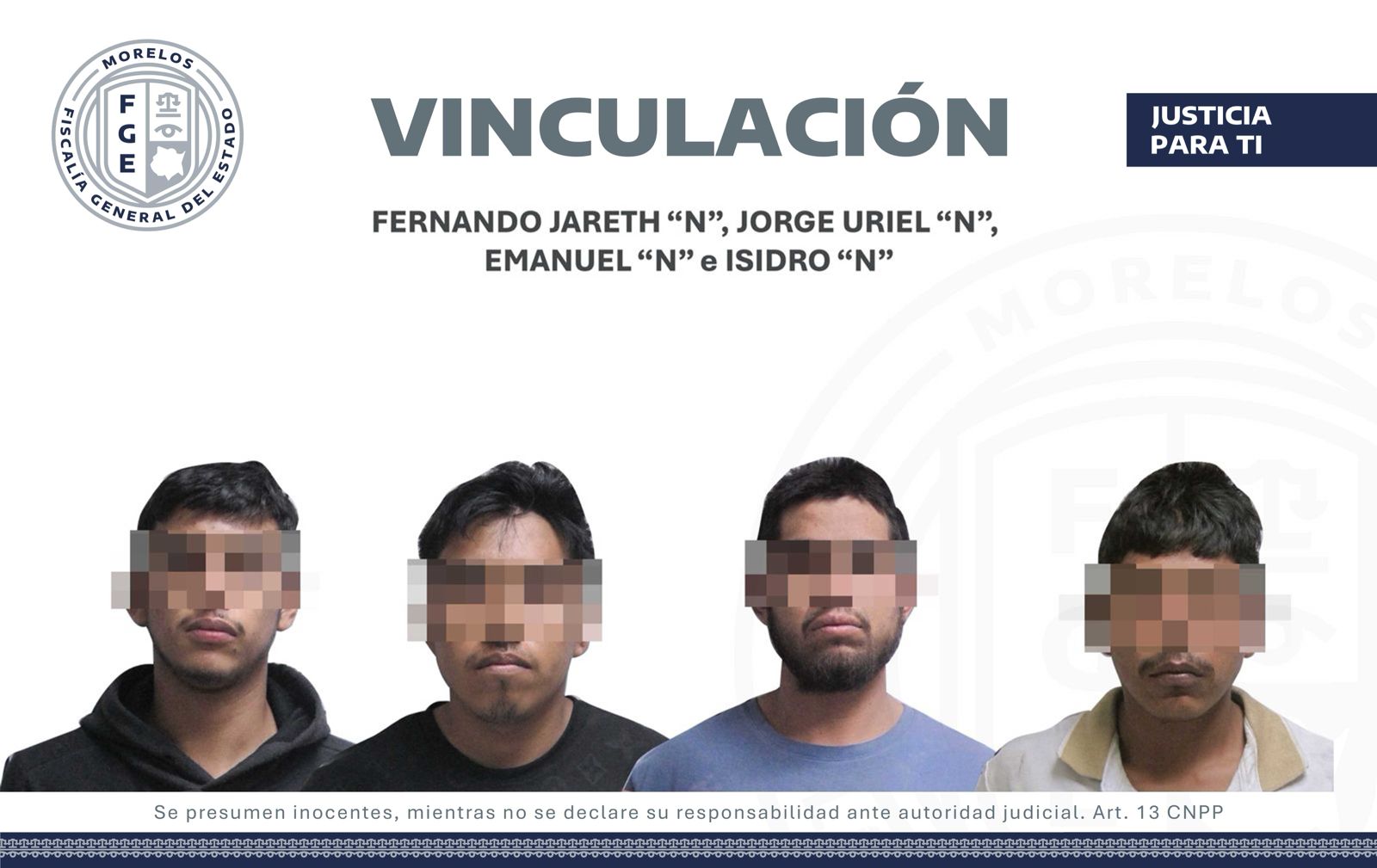 Durante la audiencia, el juez resolvió vincular a proceso a los cuatro hombres por los primeros tres delitos. Además, a Isidro “N” también lo sujetó a proceso por posesión de vehículo de procedencia ilícita y ordenó prisión preventiva para todos como medida cautelar.